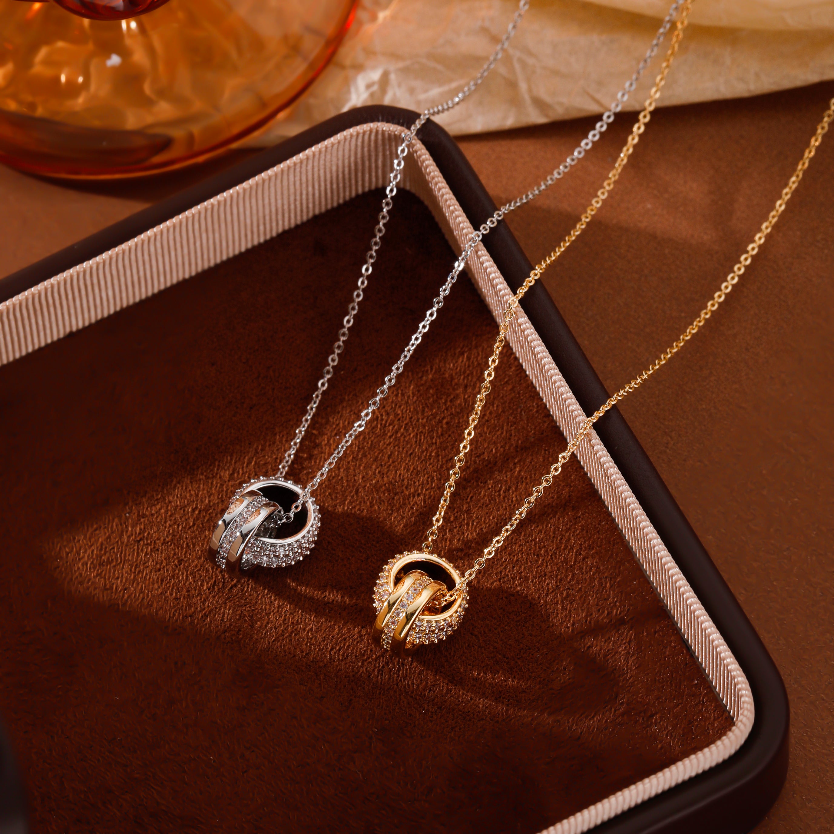 Elegant Gold Interlocking Rings Necklace with Cubic Zirconia