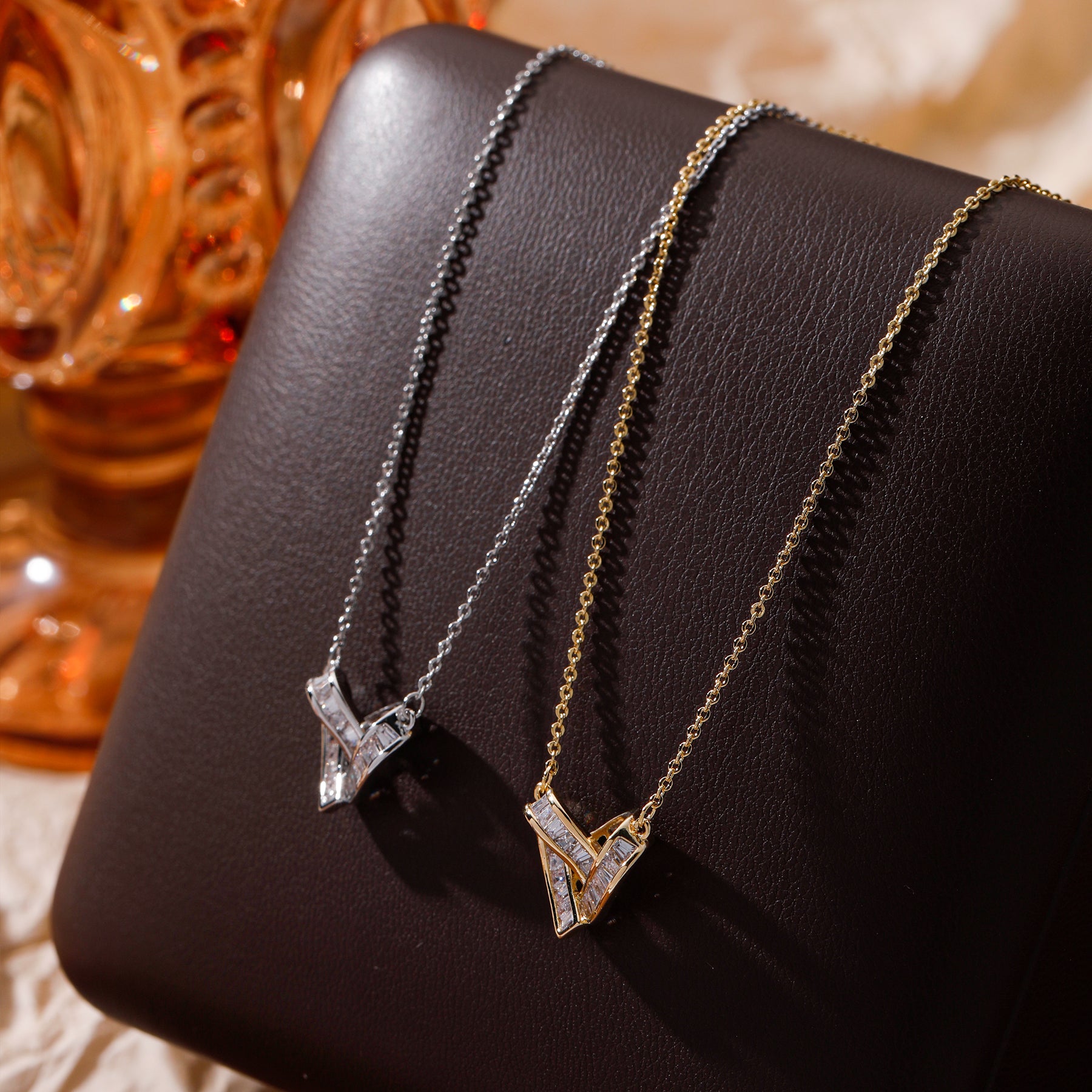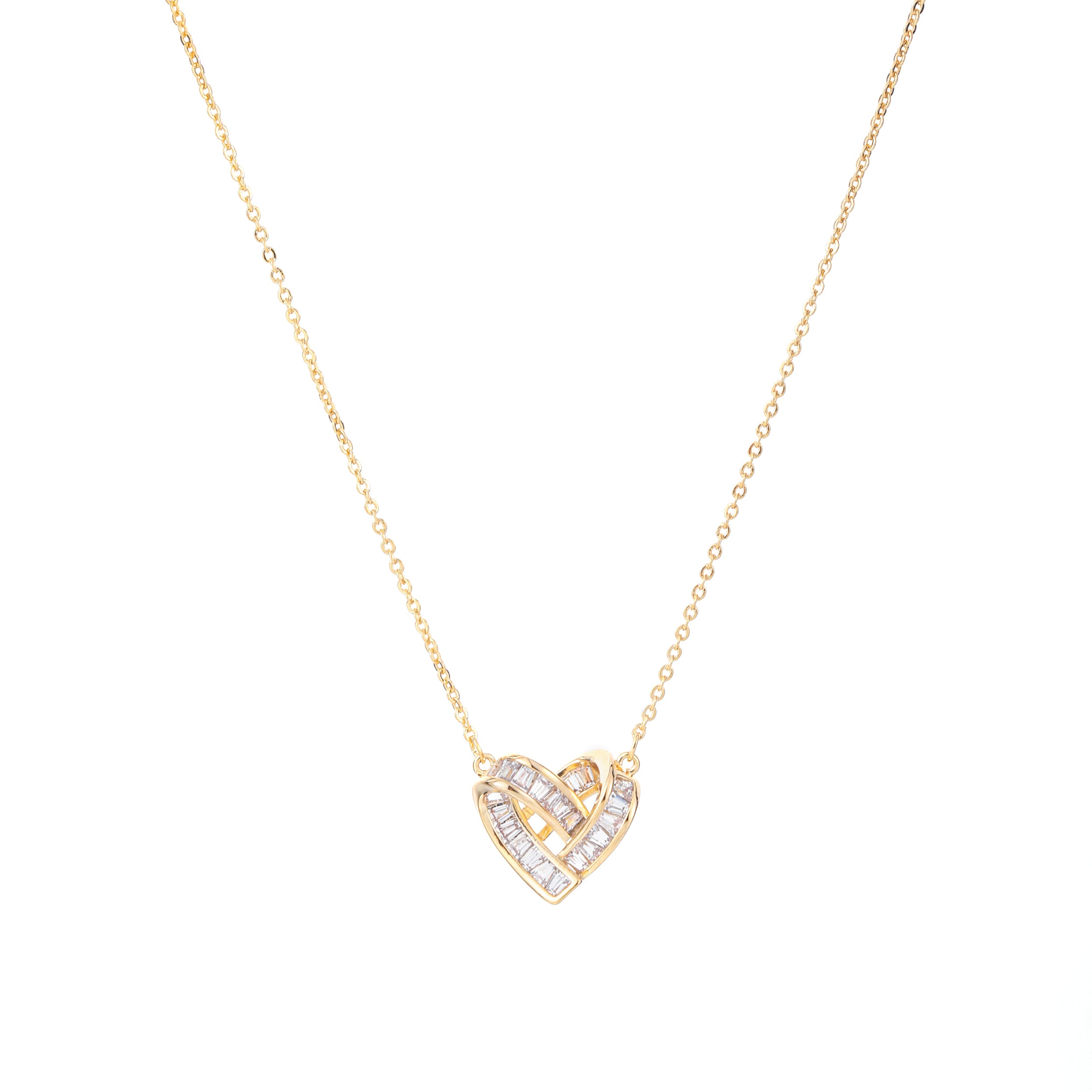 Delicate silver chain featuring a beautifully intricate heart-shaped pendant adorned with sparkling baguette crystals. Perfect for adding a touch of elegance to any outfit.