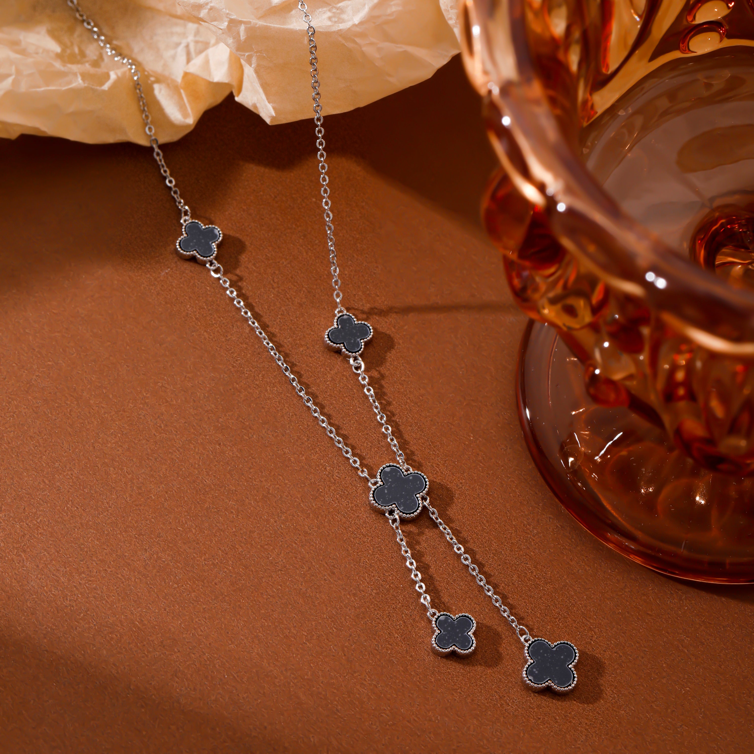Elegant silver necklace featuring multiple clover-shaped charms in black enamel. Perfect for adding a subtle yet stylish touch to any outfit.