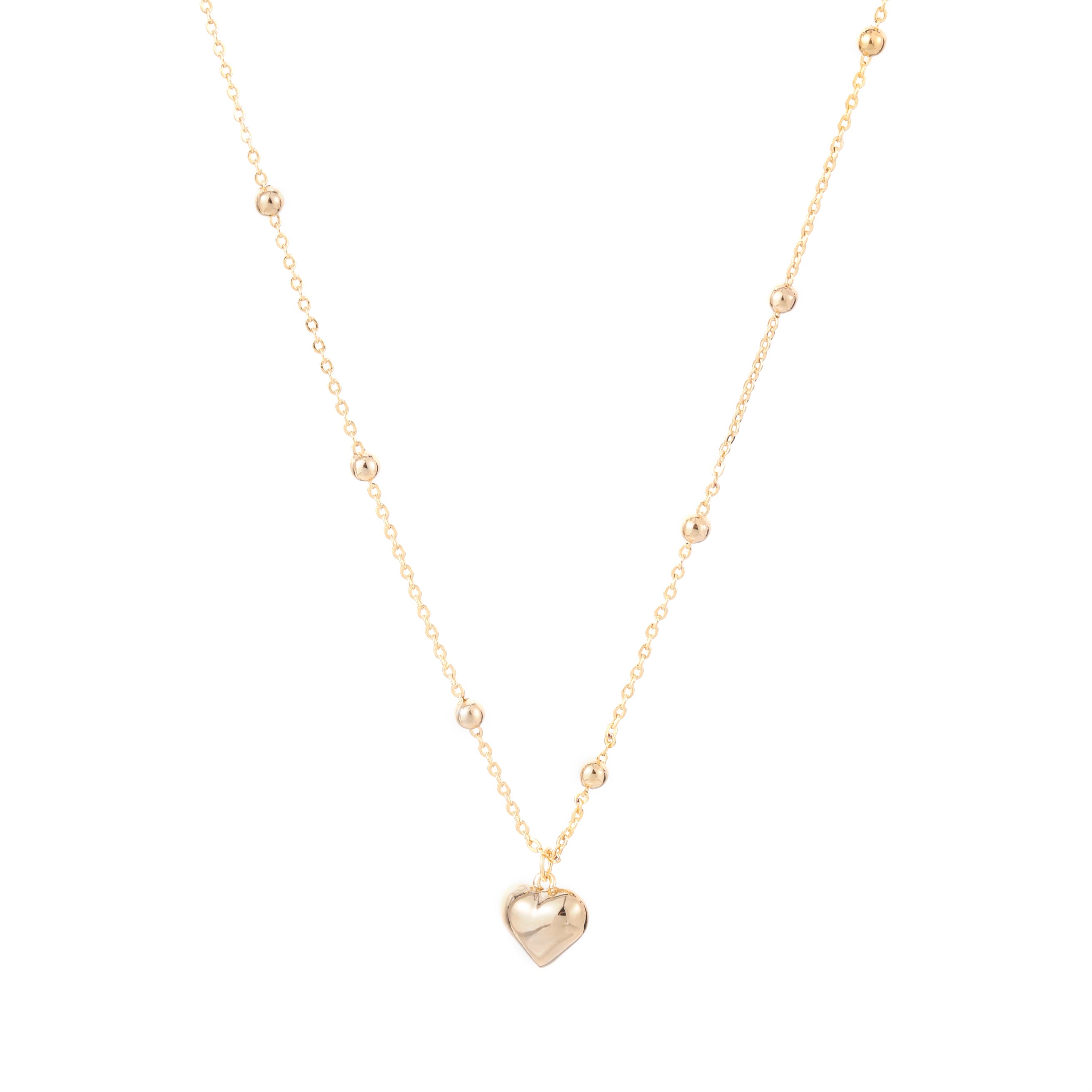 Elegant silver necklace with a delicate heart pendant. Features small silver beads along a fine chain for a timeless look.