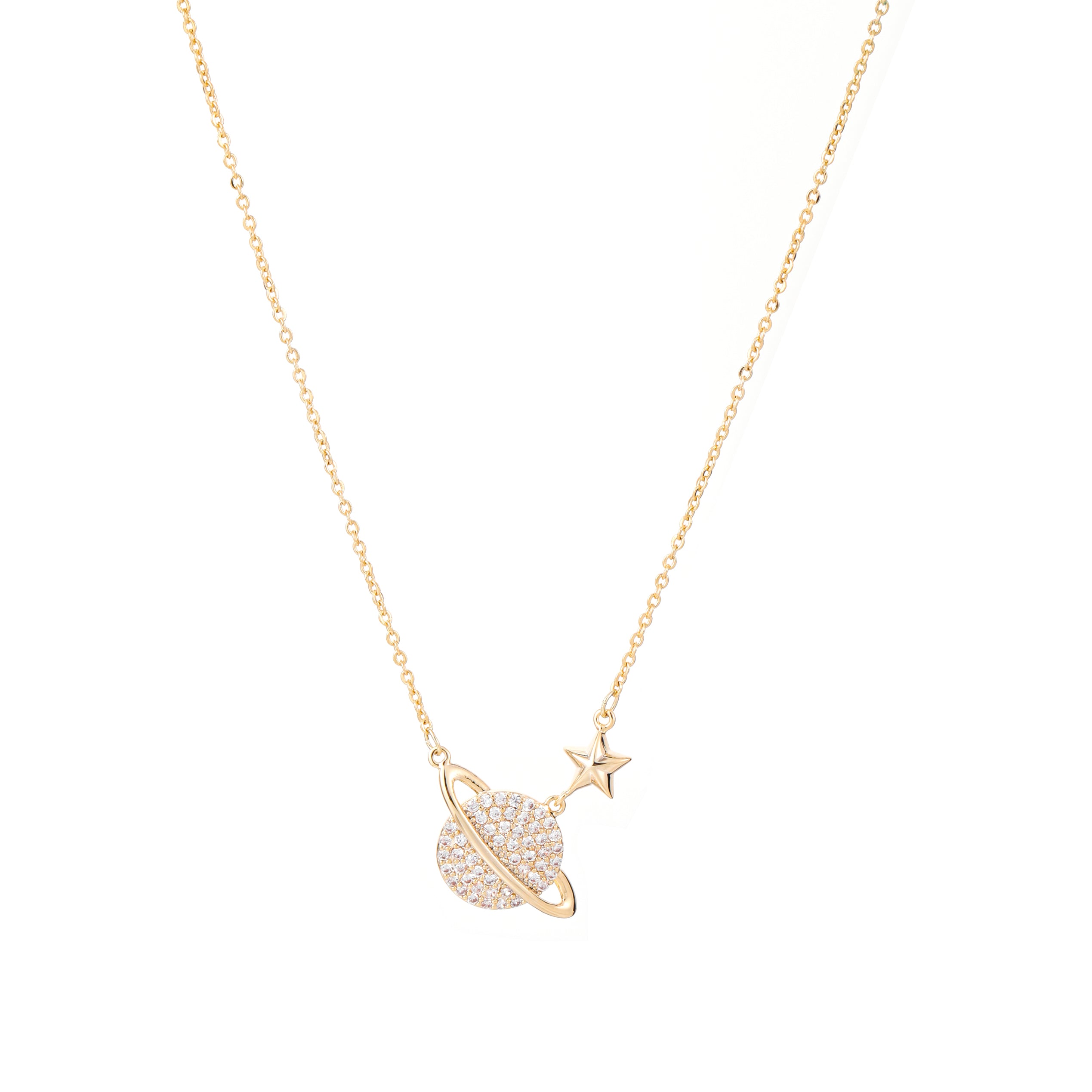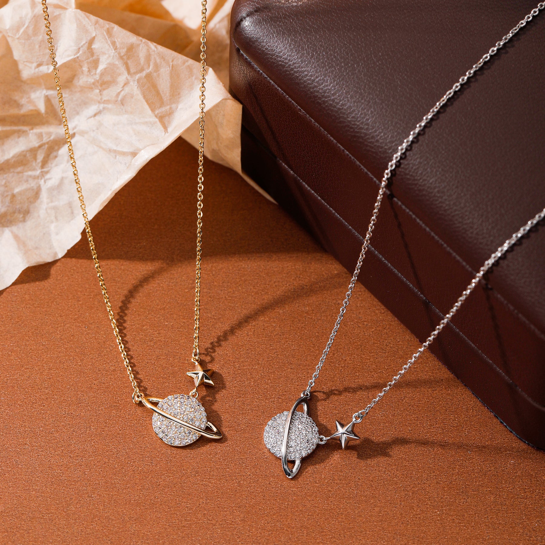 Elegant silver necklace featuring a sparkling planet pendant adorned with crystals and a charming star detail. Perfect for adding a celestial touch to any outfit.